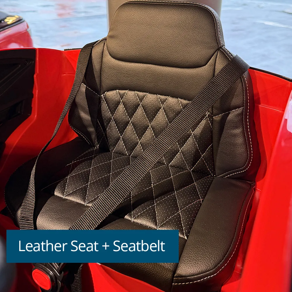 With a secure grip leather seat and a seatbelt for secure riding and puncture proof EVA rubber wheels this car can be driven by children using the steering wheel and foot pedal, while parents can over-ride at any time using the parental remote control. The remote offers forward/reverse, steering, 2-speed adjustment, and an emergency stop button for added safety.