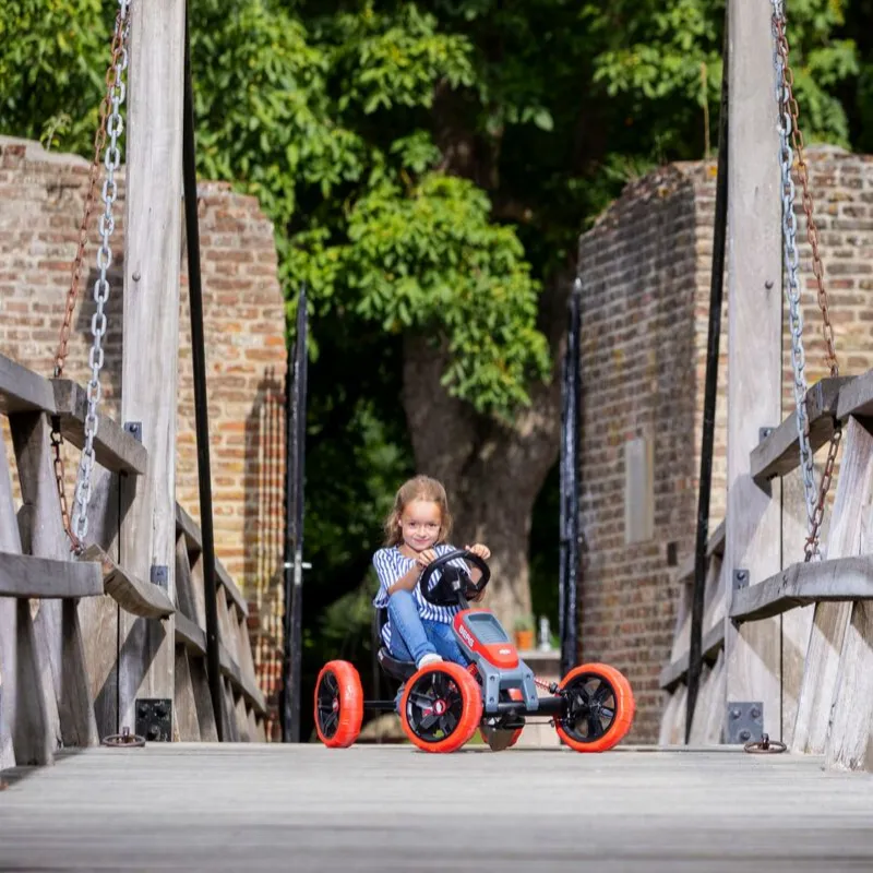 Off-road driving is exceptionally good fun with the Rebel! Children from the age of 2.5 can go-kart on this striking Reppy. The bright red EVA 10'' inch off-road tyres, cool front spoiler, red springs and unique sports steering wheel ensure a strikingly cool appearance. The sports steering wheel comes equipped with a real soundbox. This soundbox has 4 different tones: braking, tooting, starting the motor and accelerating.