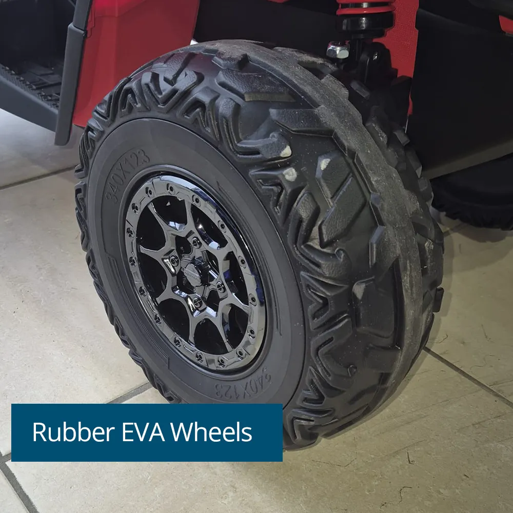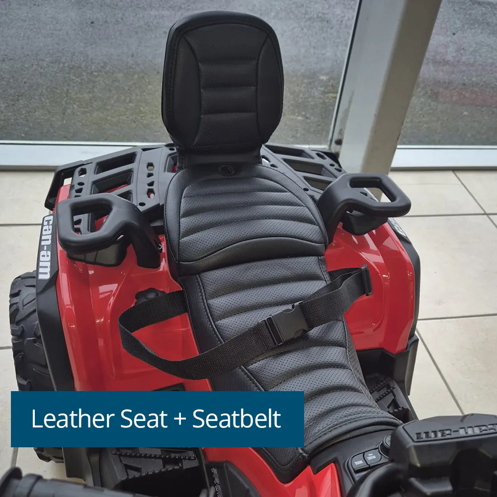 With a secure grip leather seat and a seatbelt for secure riding and puncture proof EVA Rubber wheels this quad can be driven by children using the steering bars and foot pedal