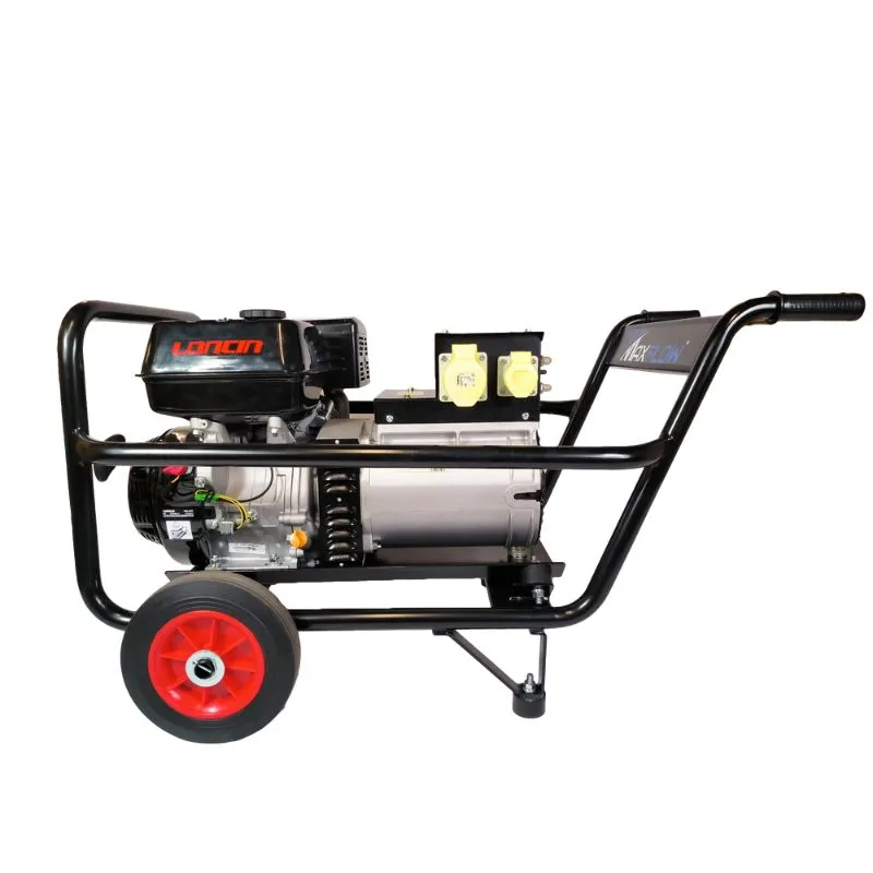 Loncin G420 site generator, fully enclosed frame design, carefully chosen rubber mounts to reduce vibration, dual voltage output. G420 engine with 'oil alert' close coupled to brushless maintenance - free smooth waveform alternator.