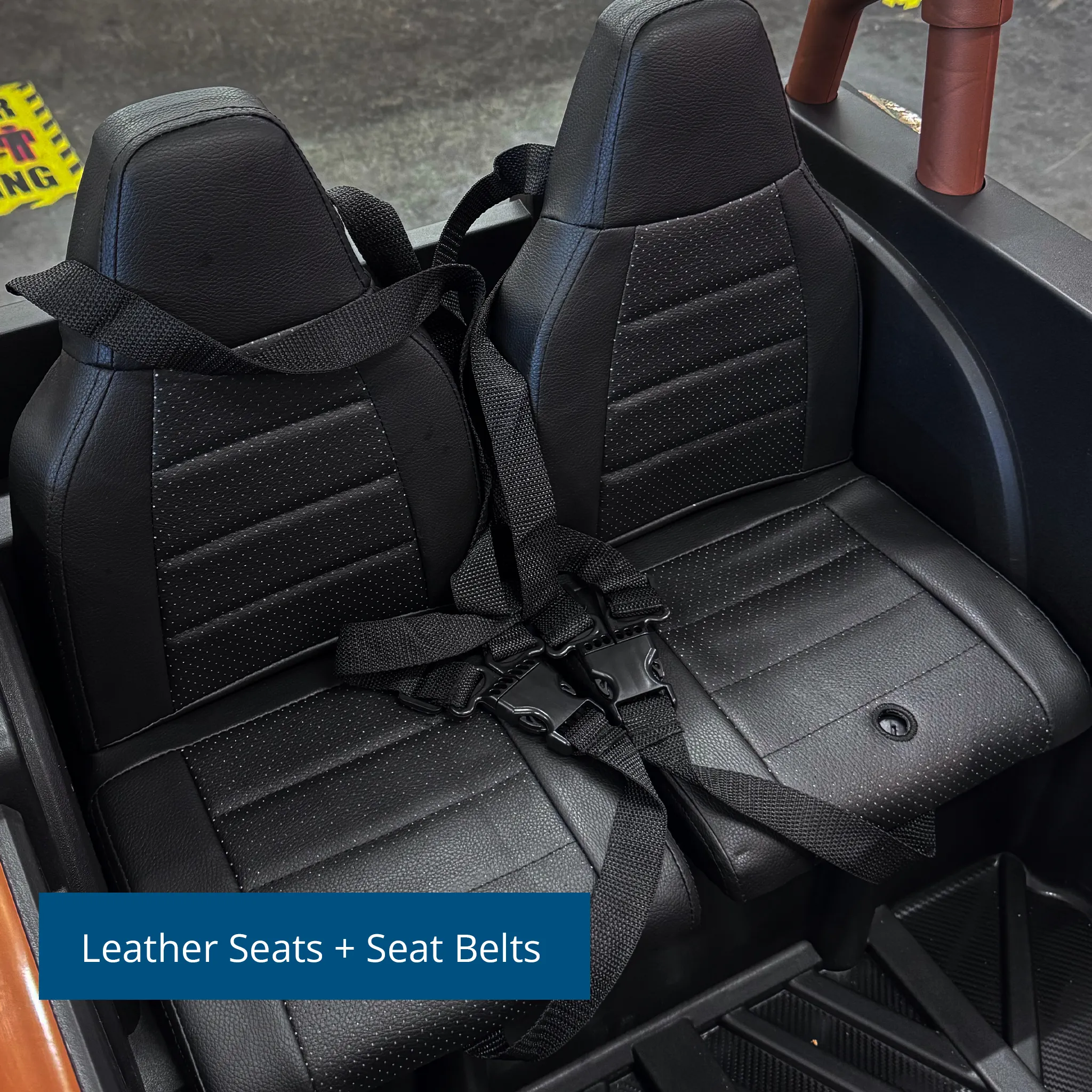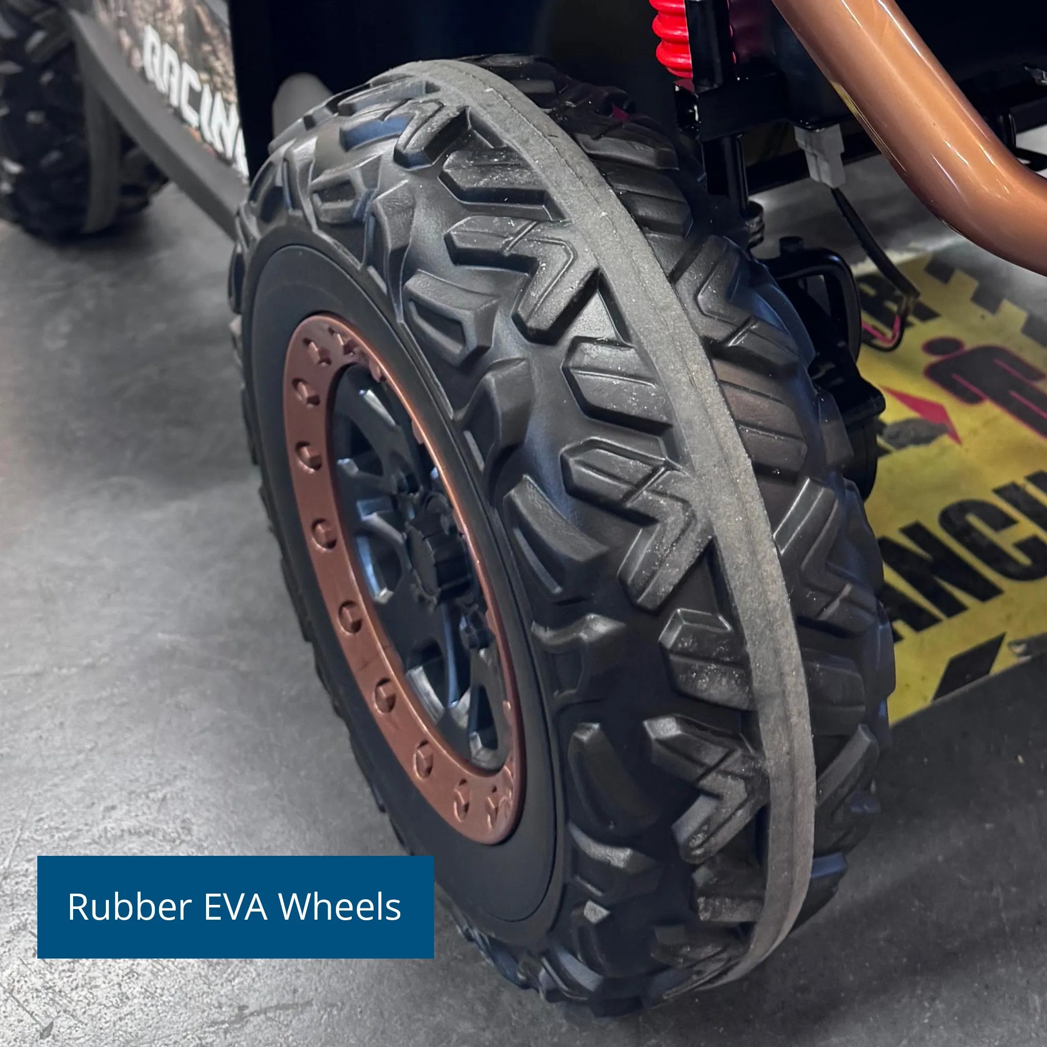 The MiniMotor Co. WildTrak 2000 4x4 ride-on has side doors that open for ease of access with two secure grip leather seats and seatbelts for secure riding and puncture proof rubber EVA wheels, LED lights and a Disco light bar. The WildTrak 2000 is 4 wheel drive with 2 speed settings and can be drove by children using the steering wheel and foot pedal, while parents can override at any time using the parental remote control.