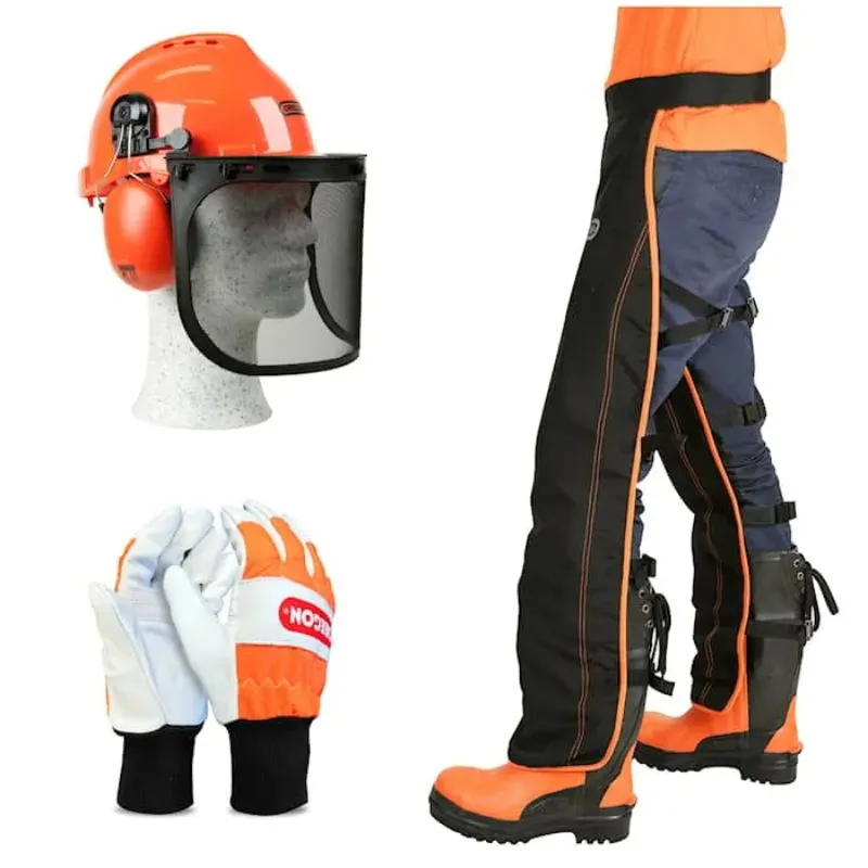 This is a pre-packed kit containing the basic protective equipment needed when using a chainsaw.