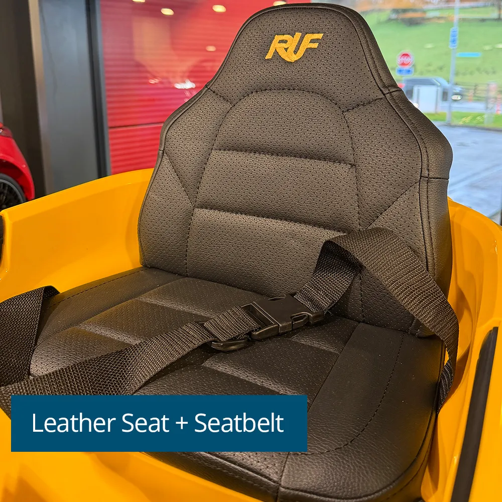 With Secure Grip Leather Seat and a seatbelt for secure riding and puncture proof rubber EVA wheels this car can be drove by children using the steering wheel and foot pedal, while parents can over-ride at any time using the parental remote control. The remote offers forward/reverse, steering, 2 speed settings and an emergency stop button for added safety.