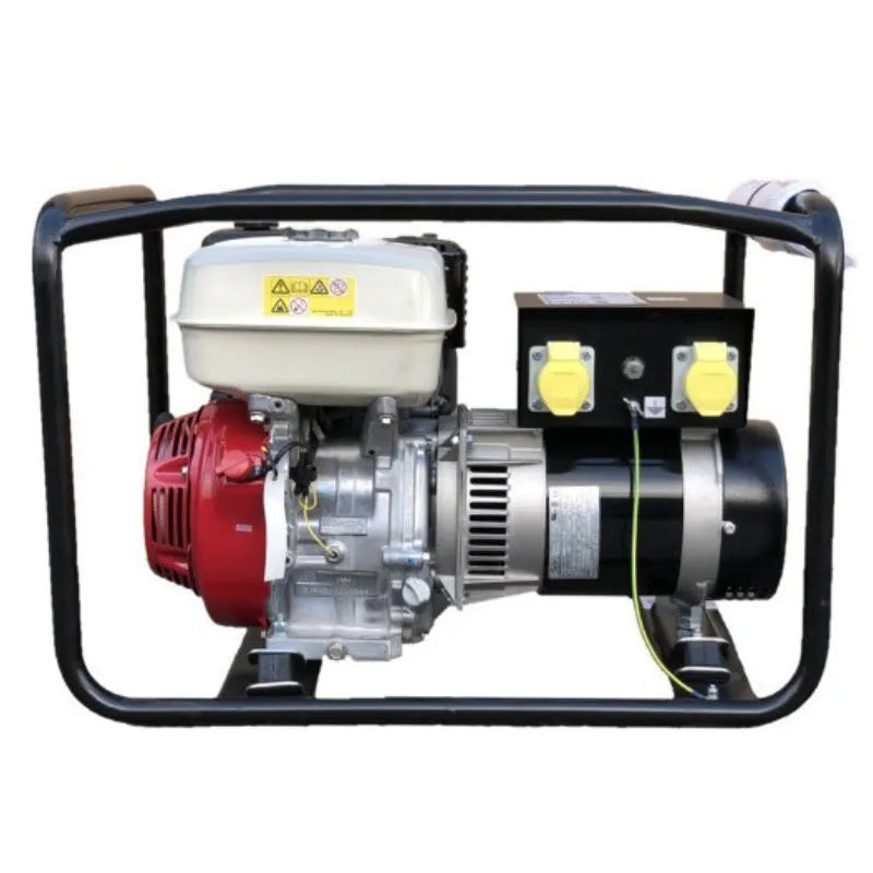 Honda GX270 powered site generator, fully enclosed frame design, carefully chosen rubber mounts to reduce vibration, dual voltage output. GX270 engine with 'oil alert' close coupled to brushless maintenance -free smooth waveform alternator.