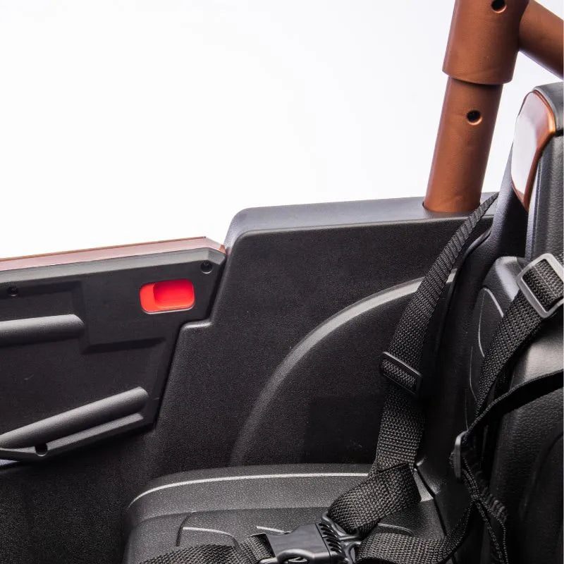 The MiniMotor Co. WildTrak 2000 4x4 ride-on has side doors that open for ease of access with two secure grip leather seats and seatbelts for secure riding and puncture proof rubber EVA wheels, LED lights and a Disco light bar. The WildTrak 2000 is 4 wheel drive with 2 speed settings and can be drove by children using the steering wheel and foot pedal, while parents can override at any time using the parental remote control.
